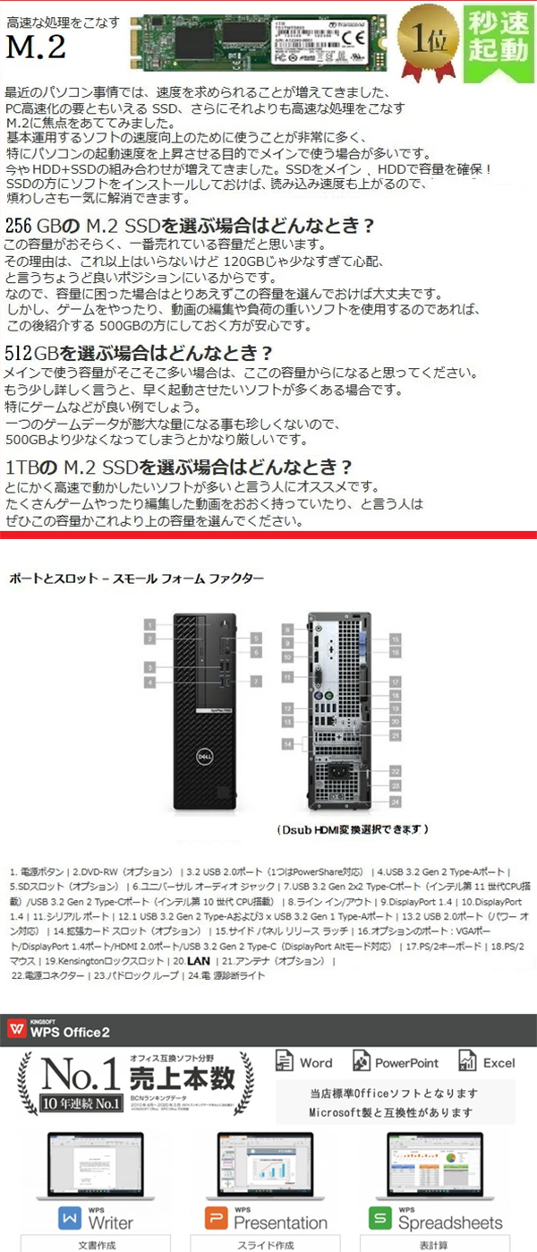 Toggle【商品の説明】中古 デスクトップパソコン PC デル DELL optiplex 7090 SF Windows11 CPU Intel 11世代 Core i7-11700 メモリ 16/32/64GB SSD 512GB 1/2/4TB 無線LAN なし モニター 22型(4画面) WPS Office