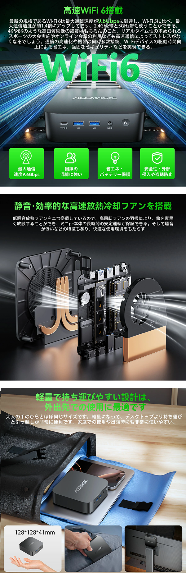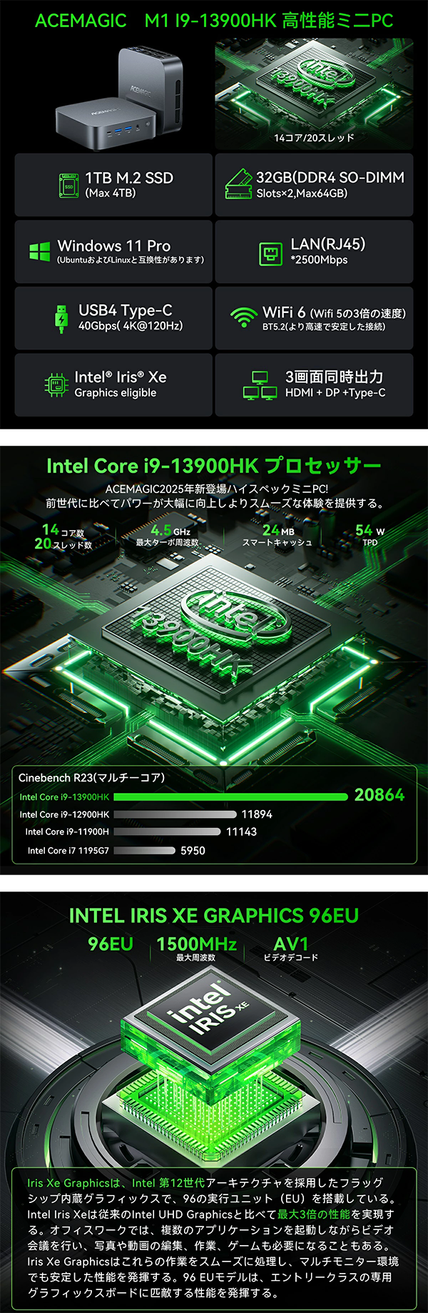 Toggle【商品の説明】新品 ミニデスクトップパソコン PC ACEMAGIC M1 Windows11 Pro CPU Intel 13世代 Core i9-13900HK メモリ 32GB SSD 1TB 無線LAN Wi-Fi6 モニター なし 3画面出力