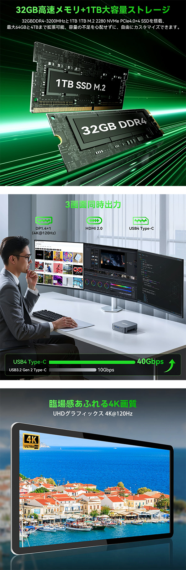- 4k@120Hz画面表示にも対応でき、質の高いビジュアル体験をお届けできる他、1*DP1.4、1*HDMI2.0と1*USB4 Type-Cインタフェースで、同時に3台のモニターに接続でき、仕事の効率を2倍に向上させることができます。