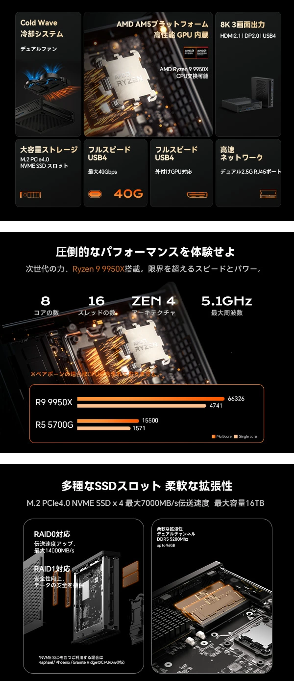 - CPU AMD Ryzen 7 8700G AMD Ryzen 9 9950X *(0+0ベアボーンキットはCPU無し)