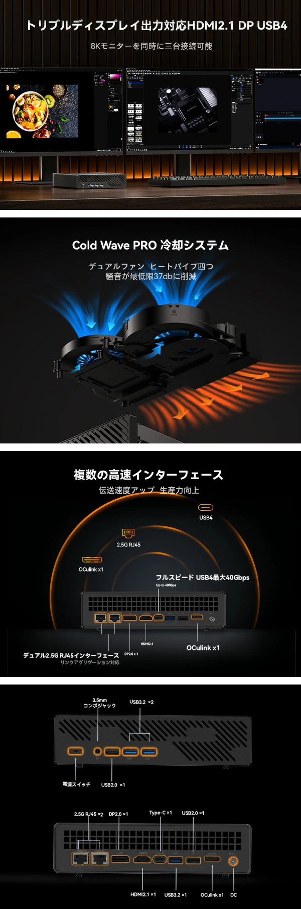 - ビデオ出力 3画面出力 HDMI2.1 ×1;DP×1;Type-C ×1(USB4)