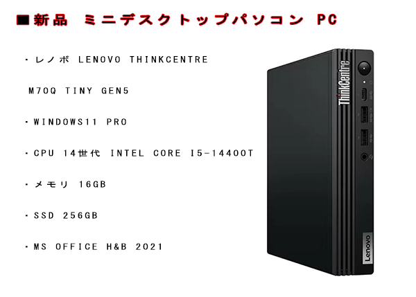 Toggle【商品の説明】新品 ミニデスクトップパソコン PC レノボ Lenovo ThinkCentre M70q Tiny Gen5 Windows11 Pro CPU 14世代 Intel Core i5-14400T メモリ 16GB SSD 256GB 無線LAN なし モニター なし MS Office H&B 2021