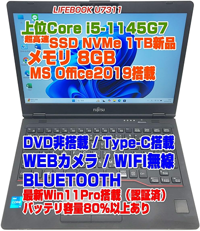 ● Amazon:価格 47,077円 (税込) このPC(富士通 LIFEBOOK U7311 第11世代 i5-1145G7)は、「メモリ8GB」「新品 SSD 1TB」「Office 2019」を搭載しています。