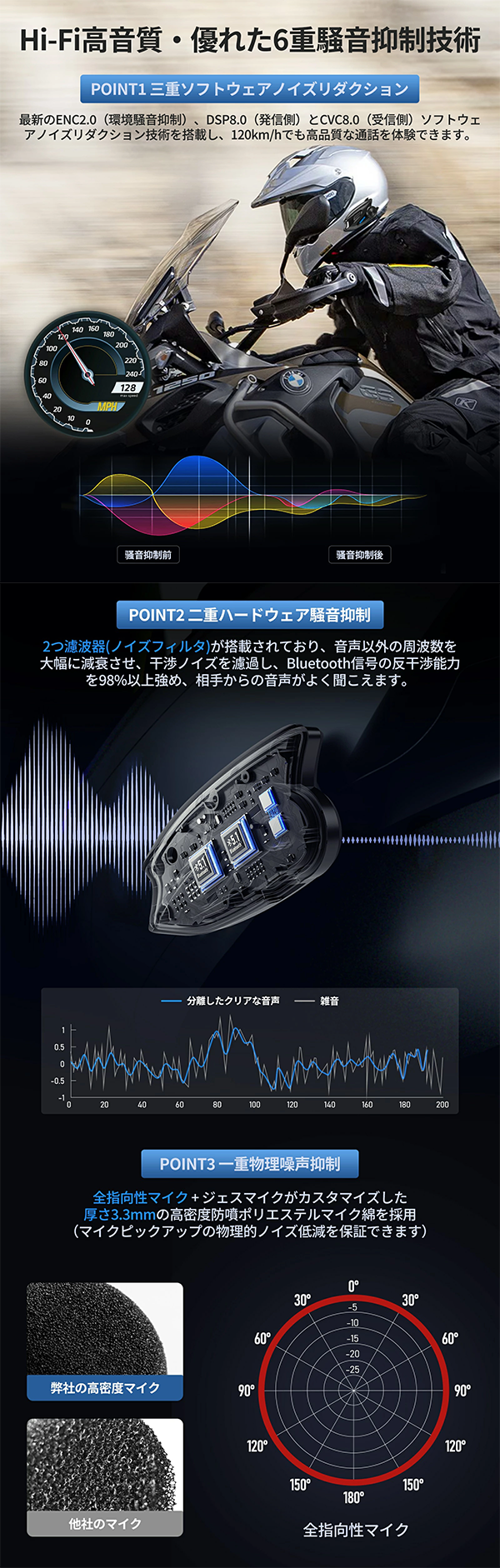 - バイクで走行中の周囲環境騒音を大幅に低減させるだけではなく、クリアな音声を取り込み、通話双方に高音質な音声をお届けることができます。