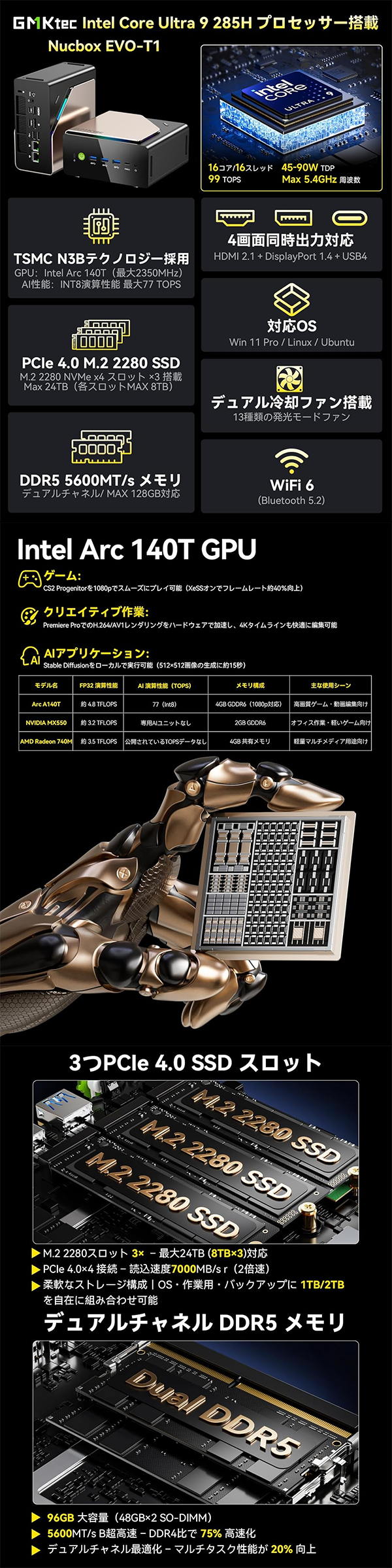 Toggle【商品の説明】新品 ミニデスクトップパソコン PC GMKtec EVO-T1 Windows11 Pro CPU 14世代 Intel Core Ultra 9 285H メモリ 96GB SSD SSD GPU Intel Arc 140T 無線LAN Wi-Fi6 モニター なし 4画面出力 Oculink対応