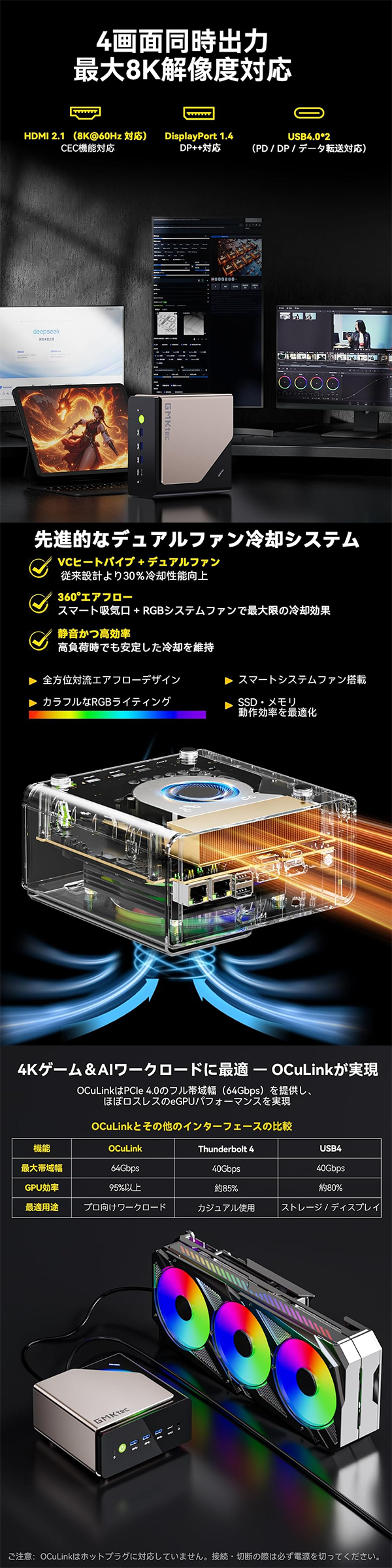 - 上位クラスのゲーミングPCにしかないOculink(PCIe Gen4×4)ポートを標準搭載。