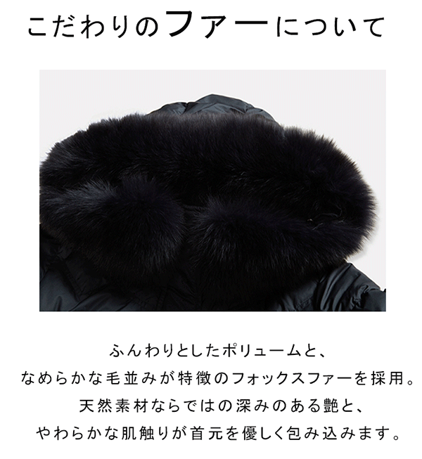 - 素材 表地 ポリエステル 100% 裏地 ポリエステル 100% 中綿 ダウン 90% フェザー 10% ファー部分 フォックスファー