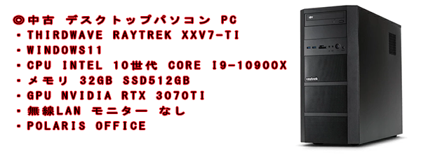 Toggle【商品の説明】中古 デスクトップパソコン PC Thirdwave raytrek XXV7-Ti Windows11 CPU Intel 10世代 Core i9-10900X メモリ 32GB SSD512GB GPU NVIDIA RTX 3070TI 無線LAN モニター なし Polaris Office