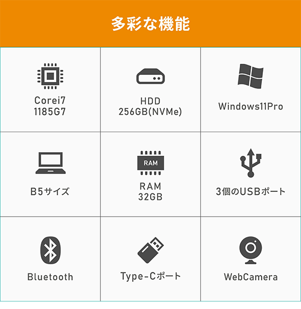 - インターフェイス SDカード、HDMI、VGA、Bluetooth、WebCamera、USB3.0x3、USB3.1 Type-Cポート(Thunderbolt 4兼用)x1
