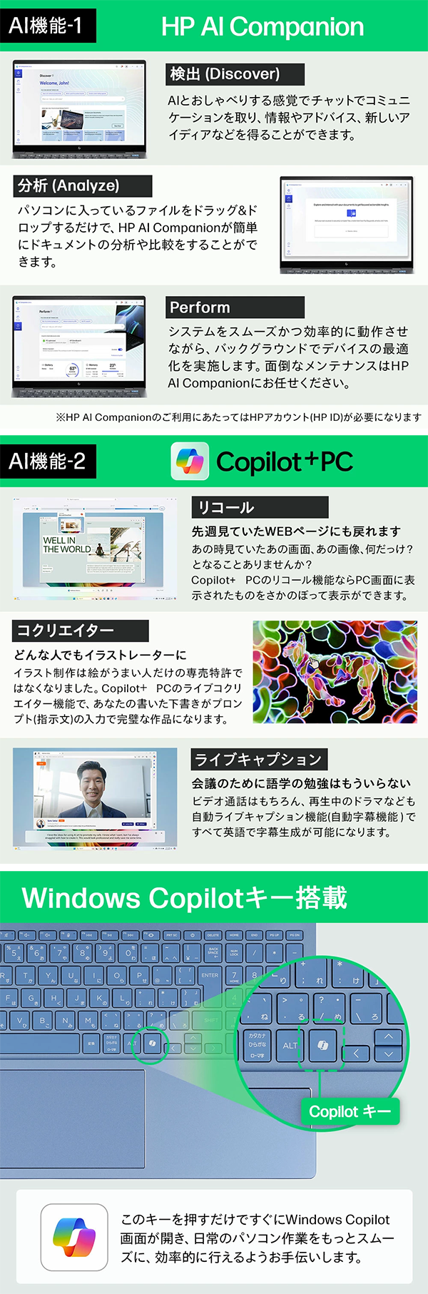 - AIアシスタントが指示や質問に答えてくれたり、複数のファイルを分析して有効なアウトプットを導き出してくれたり、PCのパフォーマンスを監視し常に最新で最高の状態に維持してくれたりする、HPオリジナルのAIツールキット。
