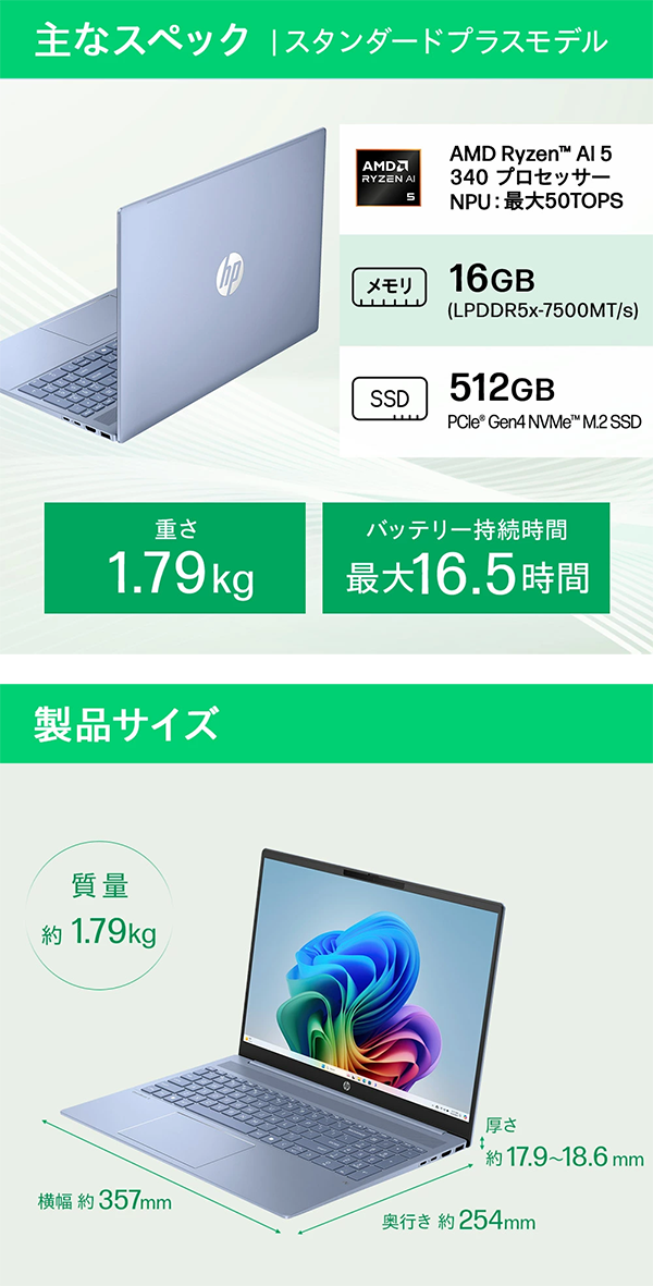 質量 約 1.79kg - バッテリ駆動時間 最大 16時間30分