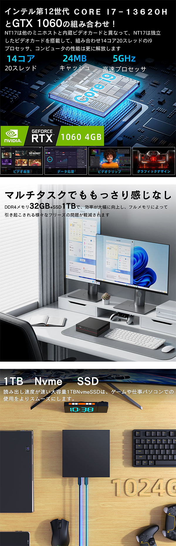 Toggle【商品の説明】新品 ミニデスクトップパソコン PC VETESA NT17-321T Windows11 CPU Intel 13世代 Core i7-13620H メモリ 32GB SSD 1TB GPU NVIDIA GeForce GTX 1060 無線LAN モニター なし Wsp Office2