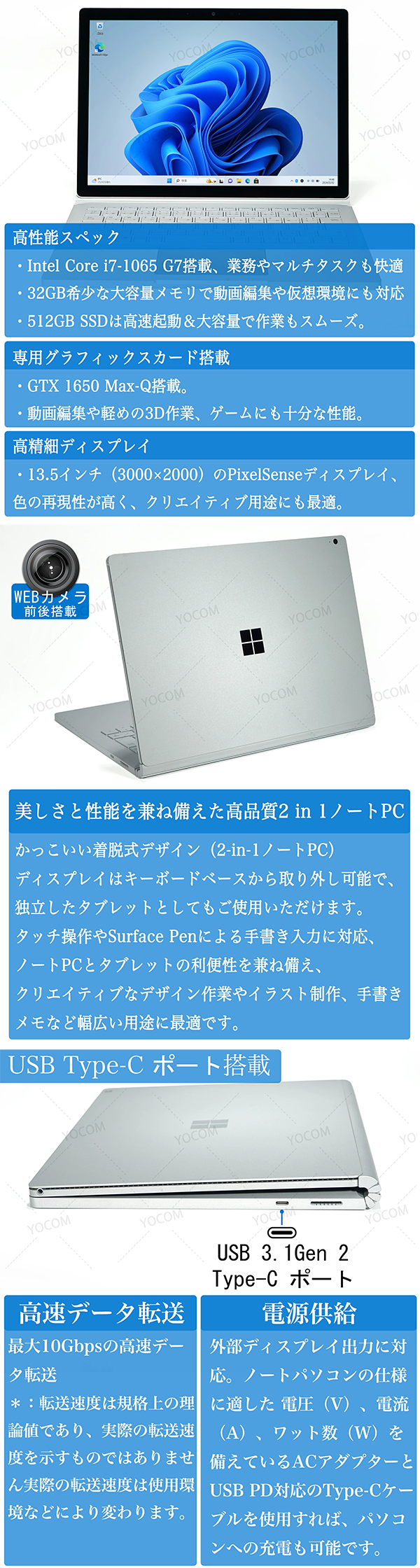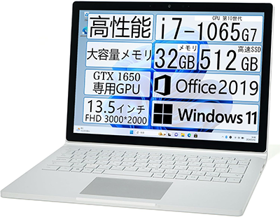 Toggle【商品の説明】中古 ノートパソコン PC MS Surface Book3 Windows11 13.5型 CPU 10世代 Core i7-1065 G7 メモリ 16/32GB SSD 256GB/512GB GPU NVIDIA GeForce GTX1650 2in1 タッチ 無線LAN Wi-Fi6 Office 2019