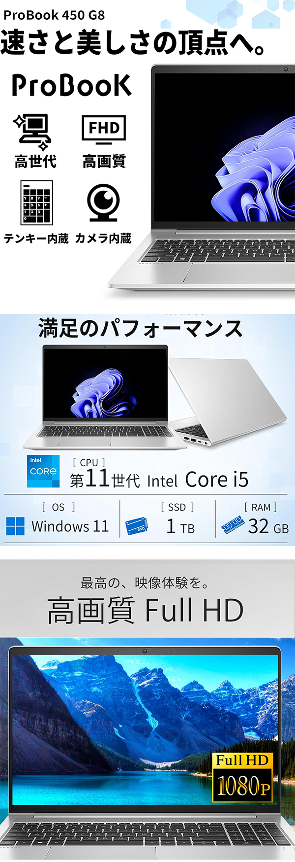 Toggle【商品の説明】中古 ノートパソコン PC HP ProBook 450 G8 Windows11 15.6型 CPU 11世代 Core i5-1135G7 メモリ 32GB SSD 1TB 無線LAN Wi-Fi6 Wsp Office