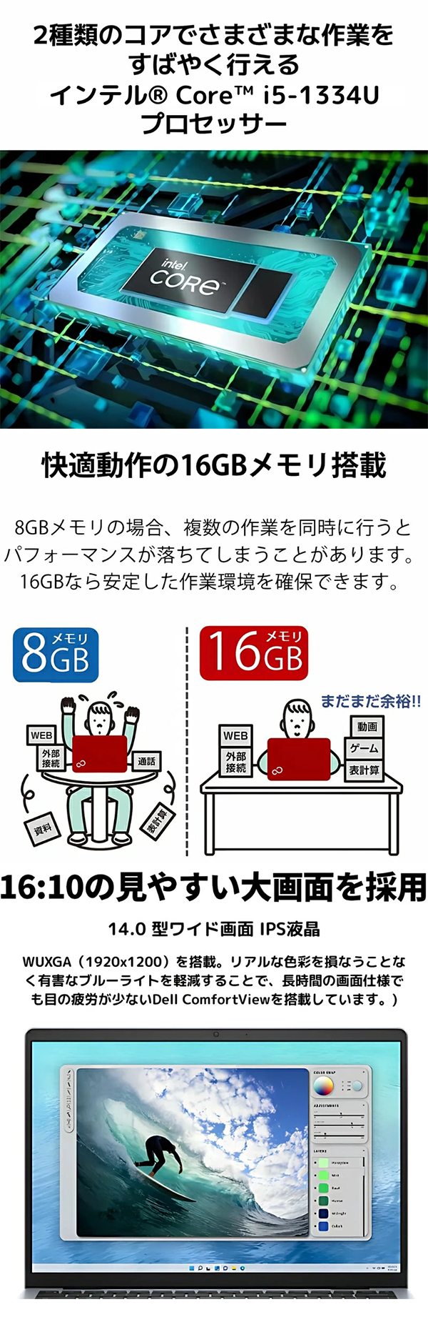 - 【ディスプレイ】14.0インチ, 16:10, FHD+ (1920 × 1200), 非光沢, 非タッチ, 300 nits, WVA/IPS, ComfortViewサポート搭載