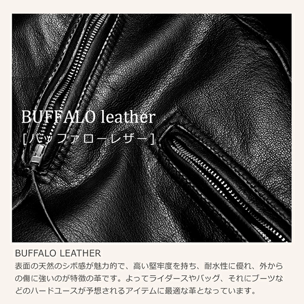 - 類稀な繊維構造ゆえに堅牢度があり、 水に強く、キズが目立ちにくいのが特徴のバッファロー革を使用しています。