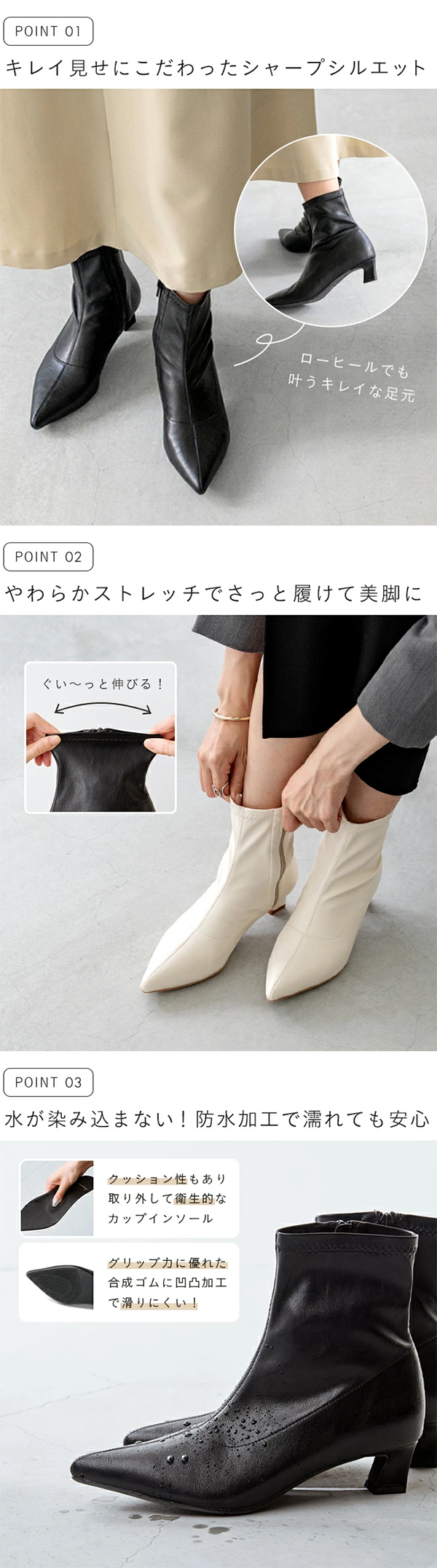 - シンプルなショートブーツは旬見せのポインテッドトゥにアップデート。