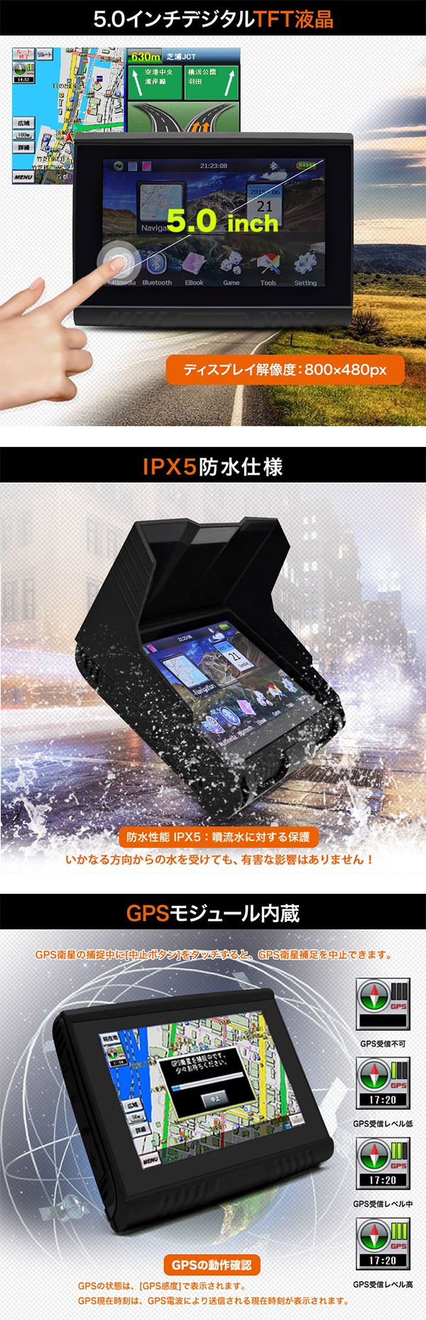 ▶ 防水設計!5インチサイズのバイク用ナビ