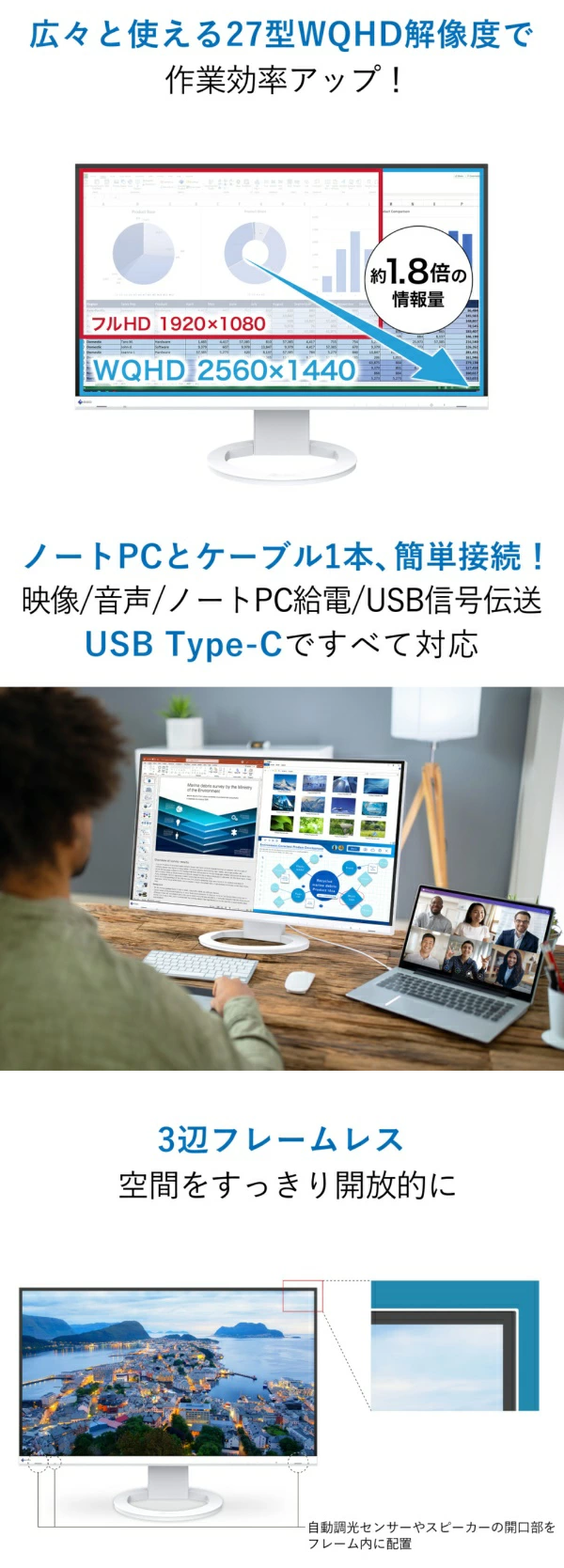 - USB Type-C対応、27型WQHD 多様化する働き方に応えるビジネス向けニュースタンダード