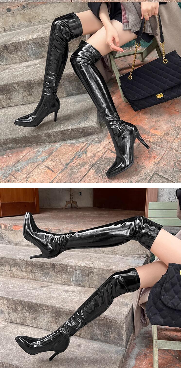 Toggle【商品の説明】レディース ニーハイ サイハイ ブーツ エナメル ポインテッドトゥ ピンヒール7/9cmク