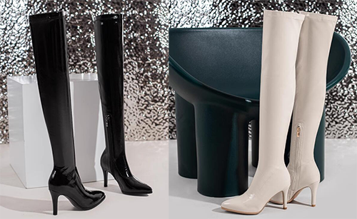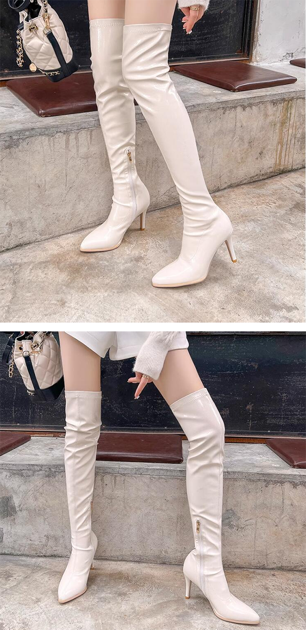 ▶ 楽天市場のサイト: レディース ニーハイ サイハイ ブーツ エナメル ポインテッドトゥ ピンヒール7/9cm