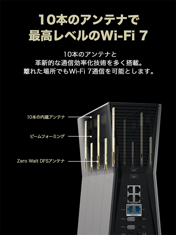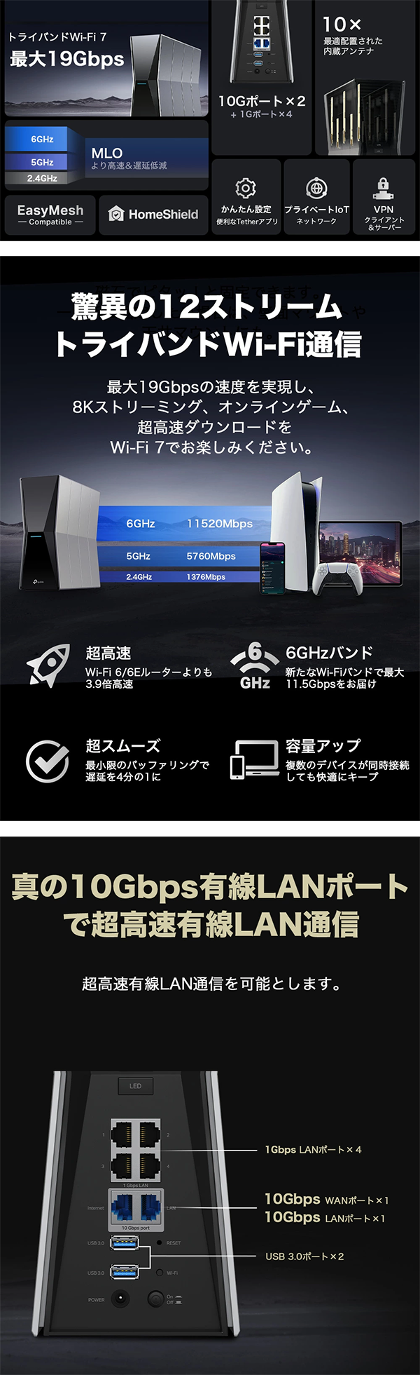 - 19GbpsトライバンドWiFi 7:接続デバイスにフルスピードを提供し、スムーズな4K/8Kストリーミング・快適なAR/VRゲーム・超高速ダウンロードを実現します。