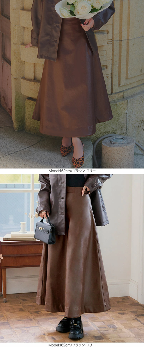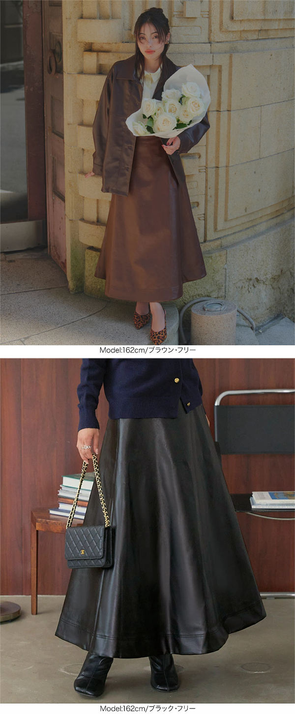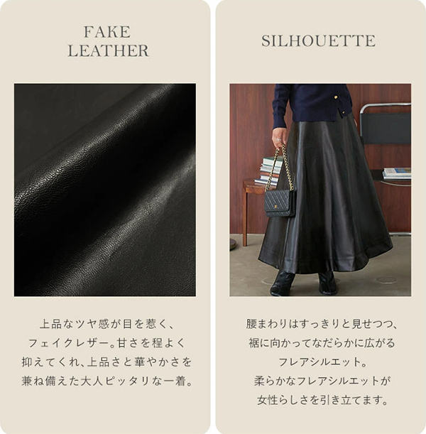 - 柔らかなフレアシルエットが女性らしさを引き立てつつ、マットなフェイクレザーが甘さを程よく抑えてくれます。