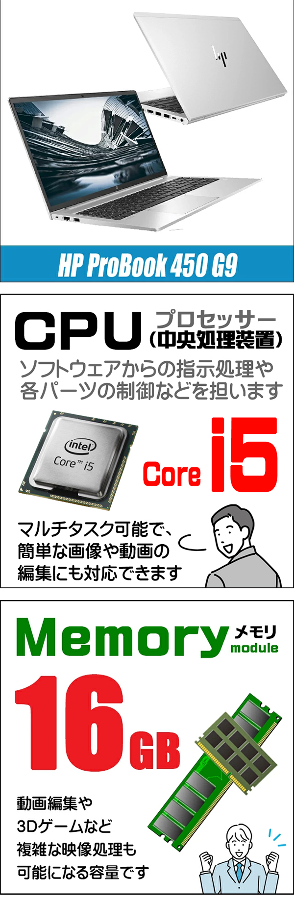 Toggle【商品の説明】中古 ノートパソコン PC HP ProBook 450 G9 Windows11 15.6型 CPU 12世代 Core i5-1235U メモリ 16GB SSD 256GB 無線LAN Wi-Fi6 Wsp Office