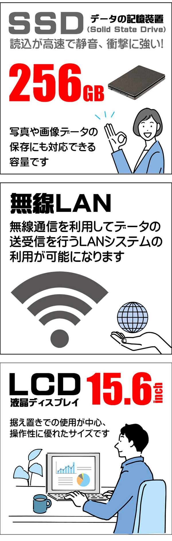 - 届いて直ぐにワープロ・表計算・プレゼンテーション等の書類づくりがはじめられます。