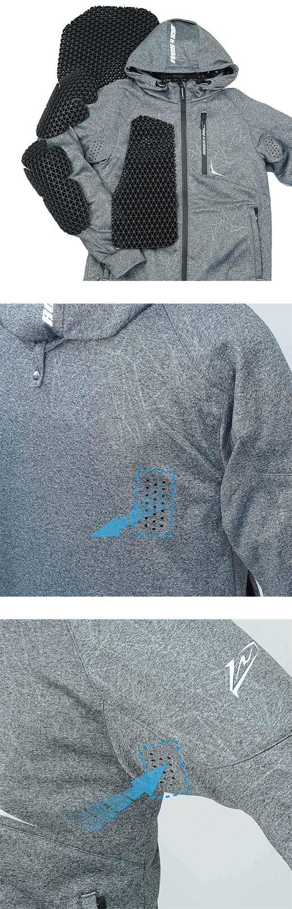 - 標準装備されたエアスルーパッド(肩・肘・脊椎・胸)とともに脇下・背中のレーザー加工のベンチレーションホールが通気性を更に高め、快適です。