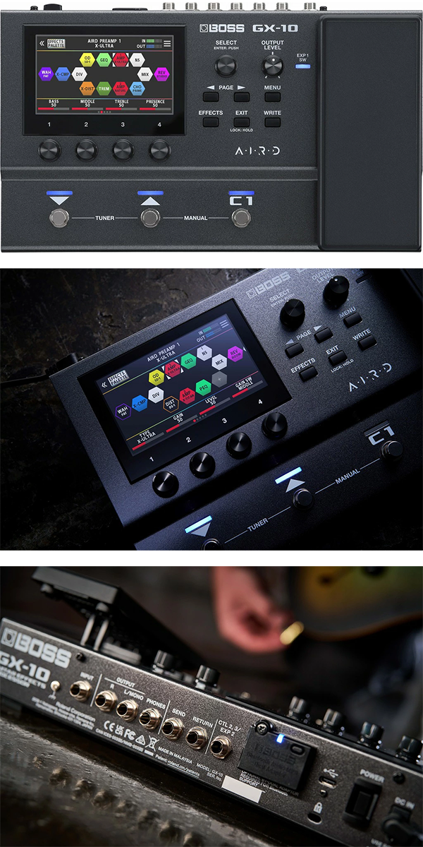 - 独自技術「AIRD」による伸びやかで立体的なアンプ・サウンドや最高峰のアルゴリズムを用いた多数のBOSSエフェクトを内蔵し、タッチ操作に対応したカラー・ディスプレイでスマートなサウンドメイクを実現します。