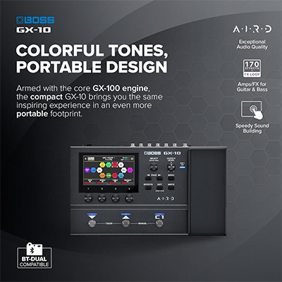 - モダンでスマートなユーザー・インターフェイスと、優れたサウンドを兼ね備えたBOSSのマルチ・エフェクターGX-100。GX-10は、そのアイデンティティをポータブルなサイズに凝縮しました。