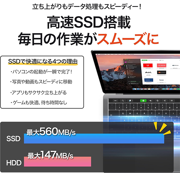 - ハードディスク 安心軽量の大容量SSD搭載 SSD512GB or SSD1TB のどちらかを選べます。