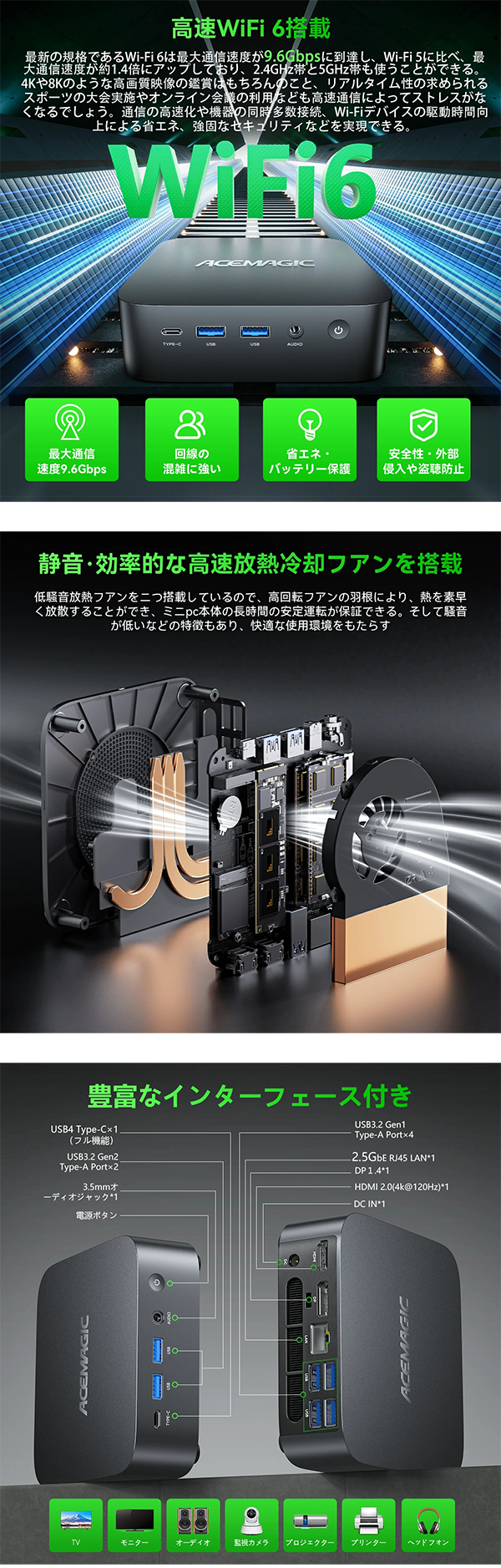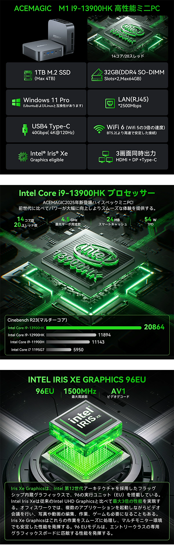 Toggle【商品の説明】新品 ミニデスクトップパソコン PC ACEMAGIC M1 Windows11 CPU Intel Core i9 13900HK メモリ 32GB SSD 1TB 無線LAN Wi-Fi6 モニター なし 3画面同時出力