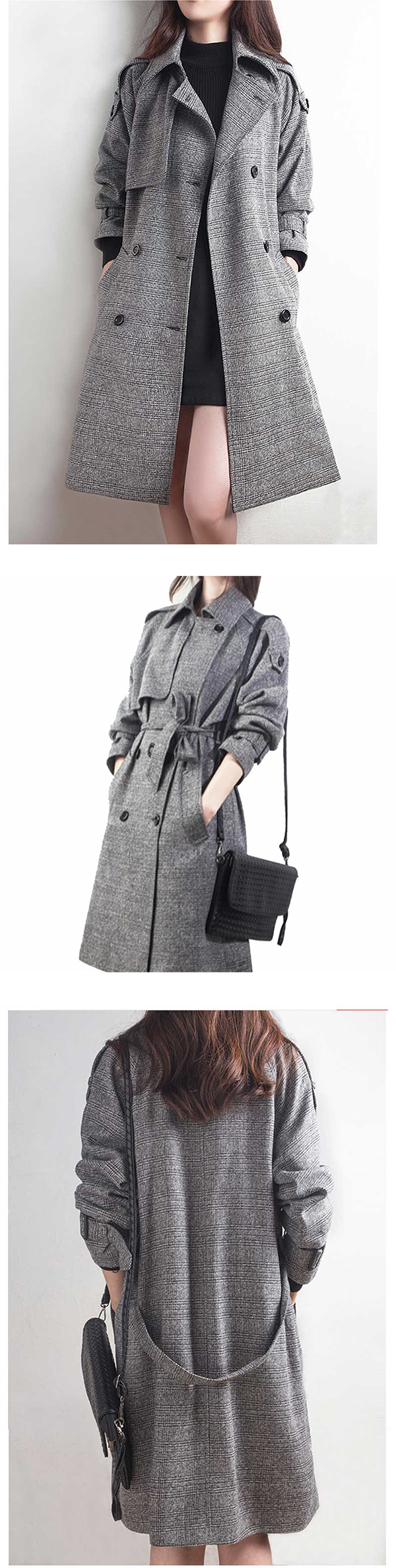 - 膝丈のトレンチコートで、付属のウエストベルトでウエストマークしていただくと、