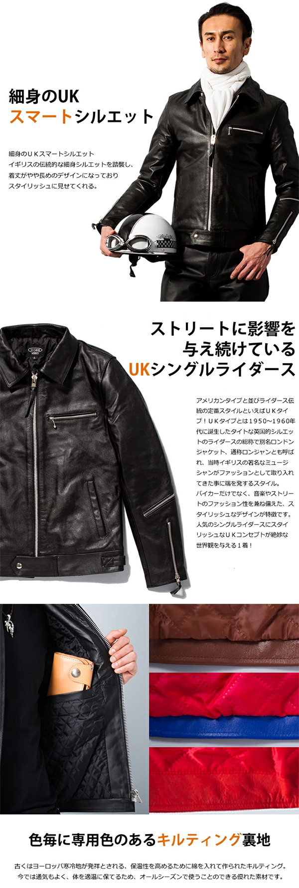 - スリムなシルエットに随所のボールチェーン、 サイドベルトにニードルレスバックル、そしてスリーブポケットにタンクガードフラップなど、 これが代表的なUKライダースの1つ、 「UK襟付シングルライダースジャケット」 です。