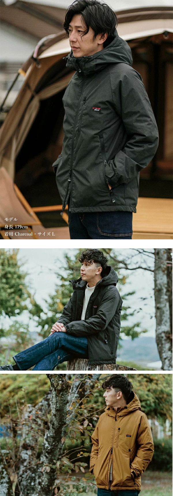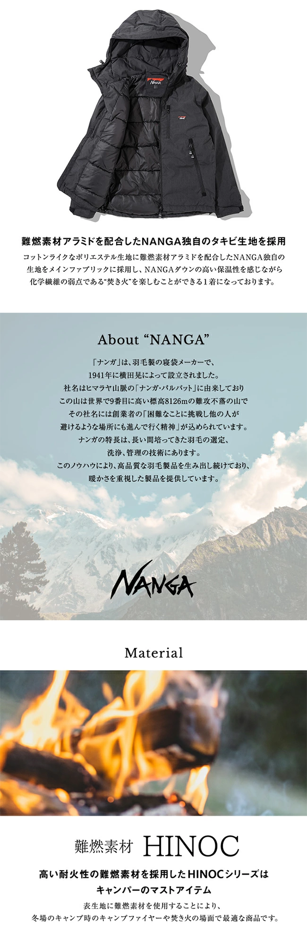 - NANGAダウンの高い保温性を感じながら 化学繊維の弱点である“焚き火”を楽しむことができる1着になっています。