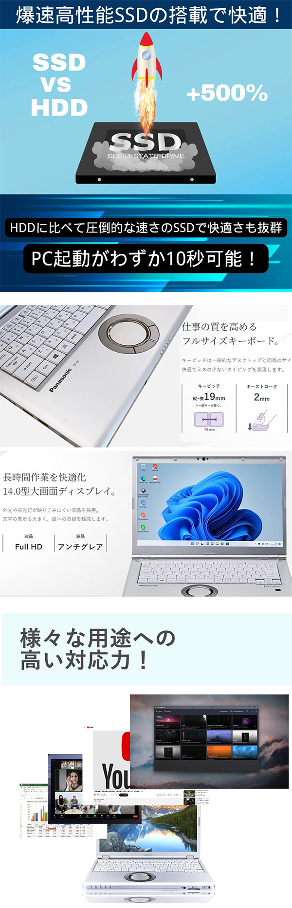 - Core i5+高速起動SSD搭載、起動時間平均16秒!とにかく速い!ストレス無し!HDDとは全く違うスピードをご堪能下さい。