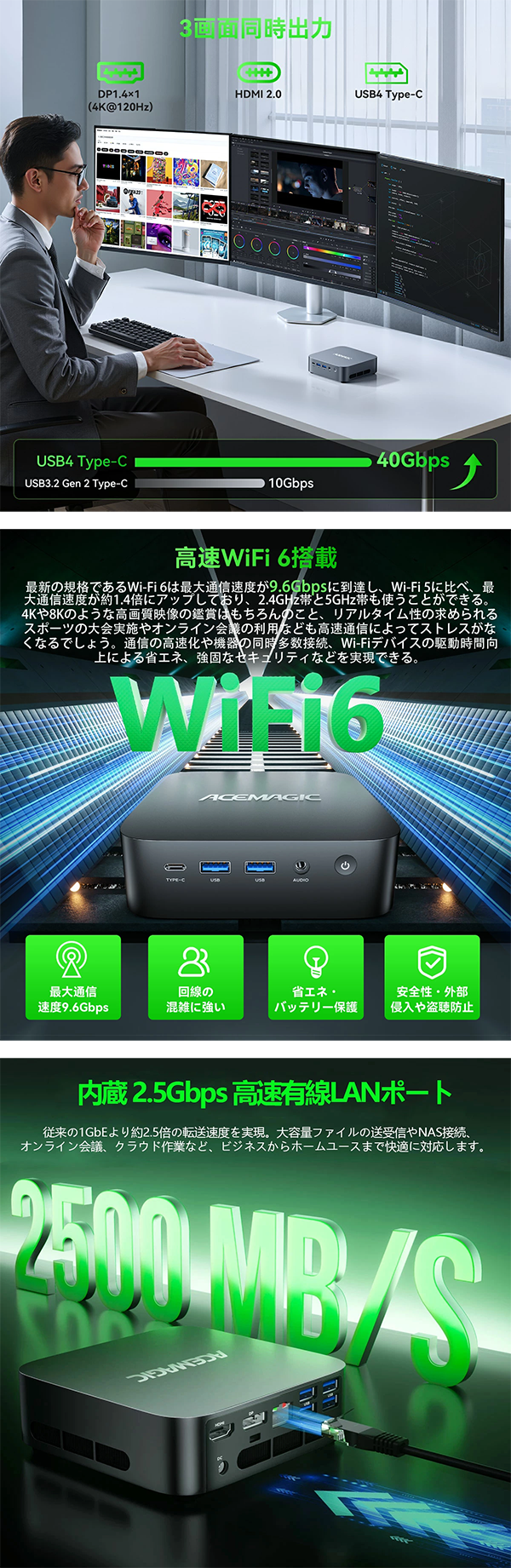 - 映像出力 3画面同時出力可能【HDMI2.0+DP1.4+TYPE-C(4K@120Hz)】