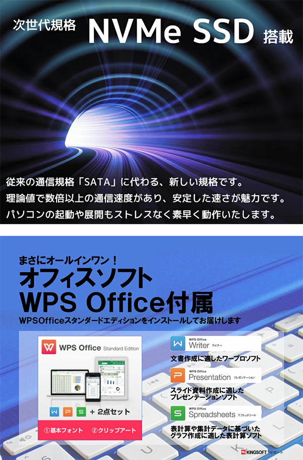 - 付属ソフト WPS Office(表計算・ワープロ・プレゼンテーション)