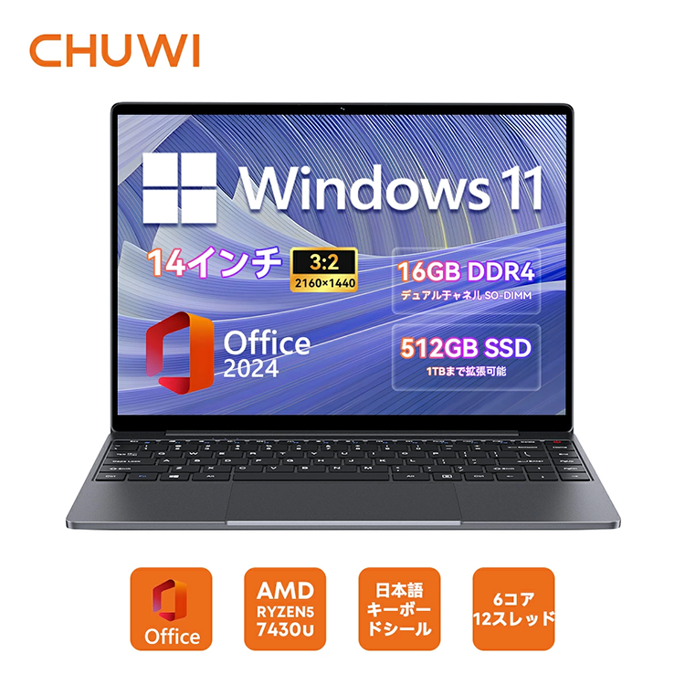 Toggle【商品の説明】新品 ノートパソコン PC CHUWI Corebook X 7430U Windows11 14型 CPU AMD Ryzen5 7430U メモリ 16GB SSD 1TB 無線LAN Wi-Fi6 Microsoft office 2024