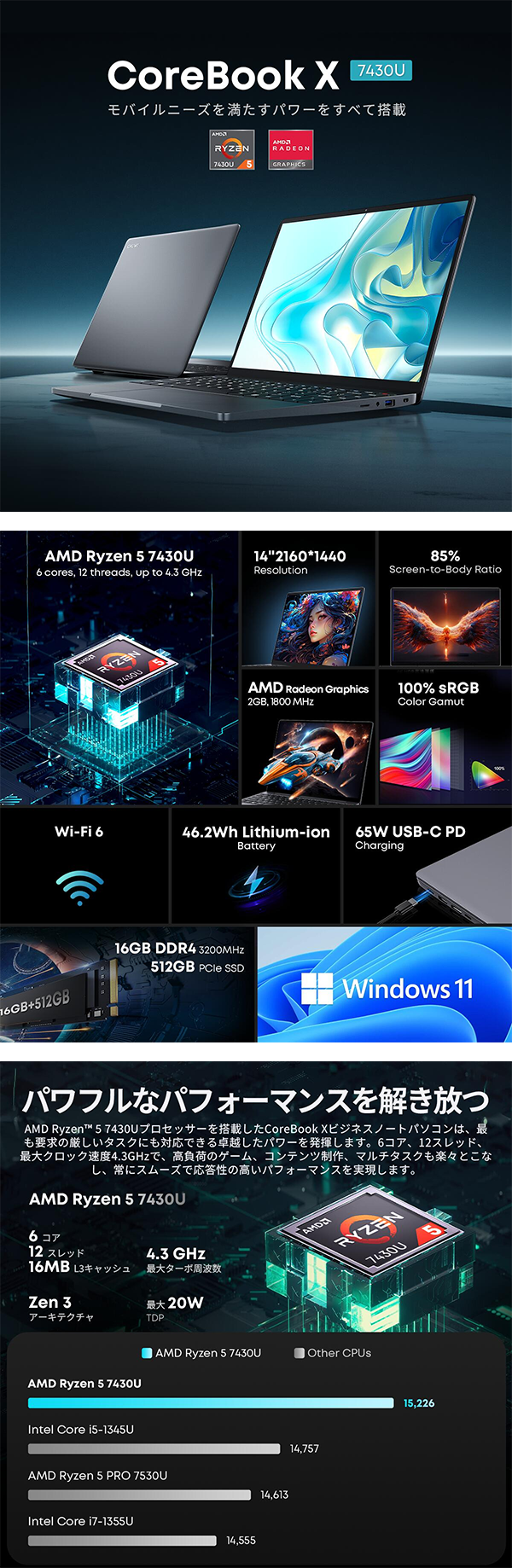 - CPU AMD Ryzen 5 7430U (6コア12スレッド、最大4.3GHz)