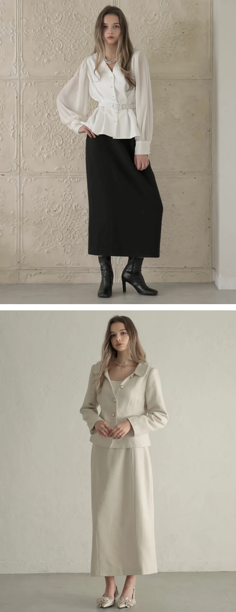 - ペプラムブラウスに合わせると上品で華やかなコーデが完成。