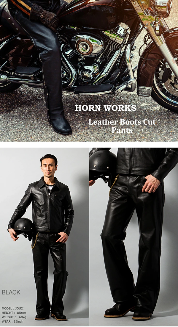 ▶ Amazonのサイト:(ホーンワークス)HORN WORKS 本革ブーツカット レザーパンツ 黒 3877