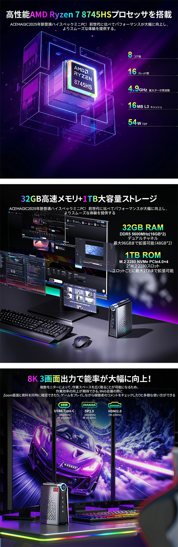 - CPU AMD Ryzen 7 8745HS (8コア/16スレッド、最大4.9GHz)
