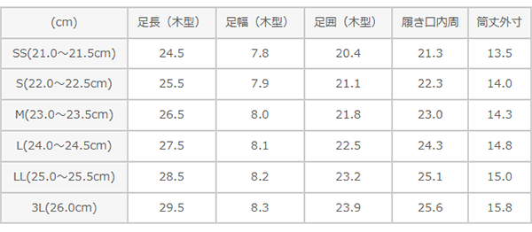 ・SS (21.0~21.5cm) ・S (22.0~22.5cm) ・M (23.0~23.5cm) ・L (24.0~24.5cm) ・LL (25.0~25.5cm) ・LLL (26.0cm)
