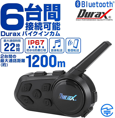 - 「Durax」ブランドの品番DAA01060のインカムは、ヘルメットに装着して最大6人での同時通話に対応した製品です。