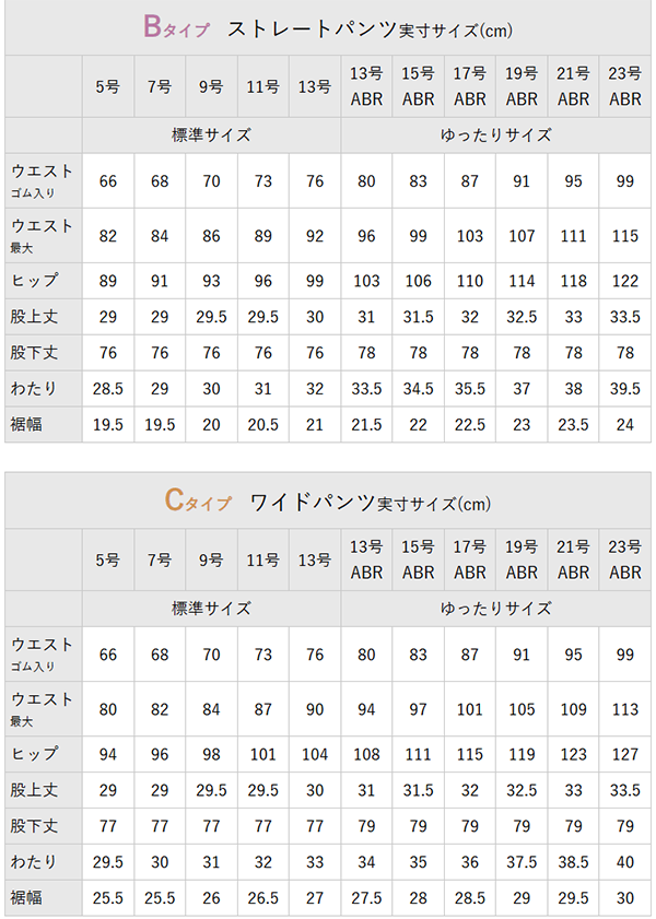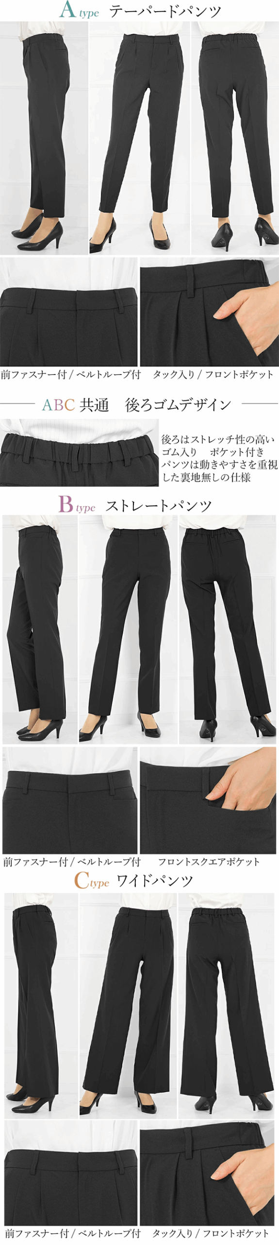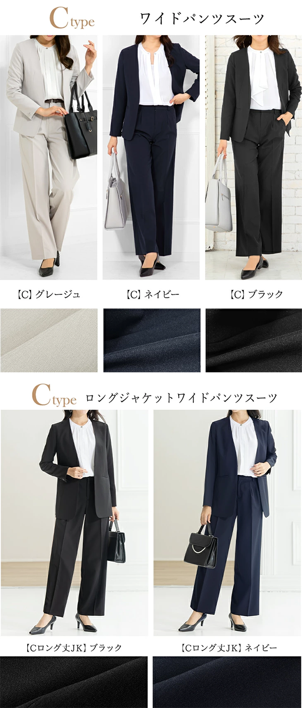 - パンツは美脚が叶うテーパードと、王道シルエットのストレート、エレガントに体型カバーできるワイドから選べる、