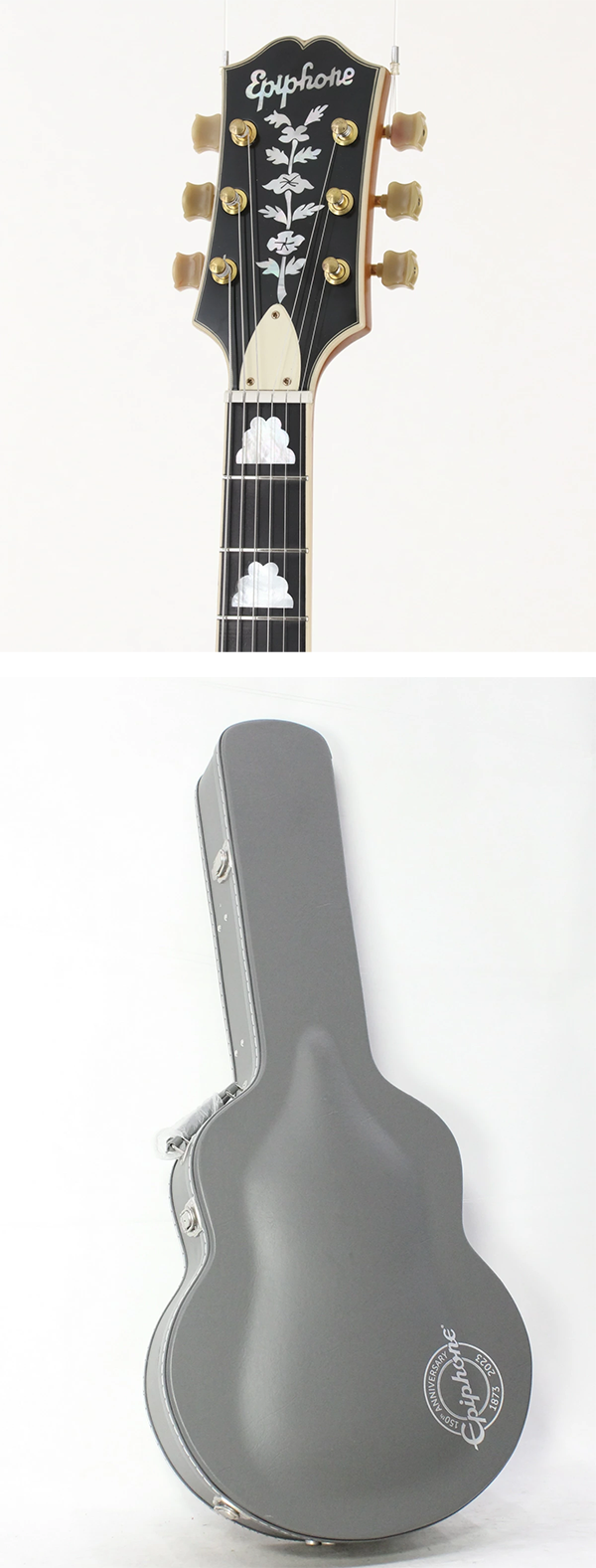 - レイヤード・メイプル・ボディ、Medium Cシェイプ・ネックにはエボニー指板、豪華なマザーオブパール・インレイ、PUはEpiphone NY Mini Humbuckerを搭載し、Historic Machine Headsやアイボリー・カラーのノブ&SWノブ、ゴールドハードウエアが映える一本です。