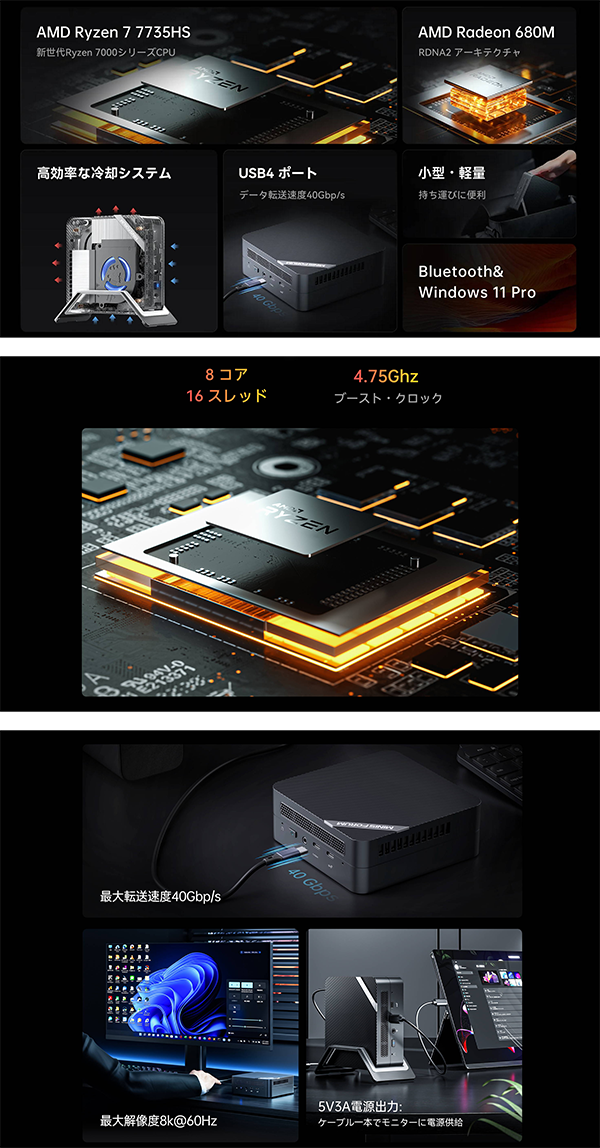 - CPU AMD Ryzen 7 7735HS (8 コア/16 スレッド 、L2キャッシュ合計4MB、L3キャッシュ合計16MB、基本クロック3.2GHz、最大ブースト・クロック4.75GHz)